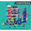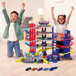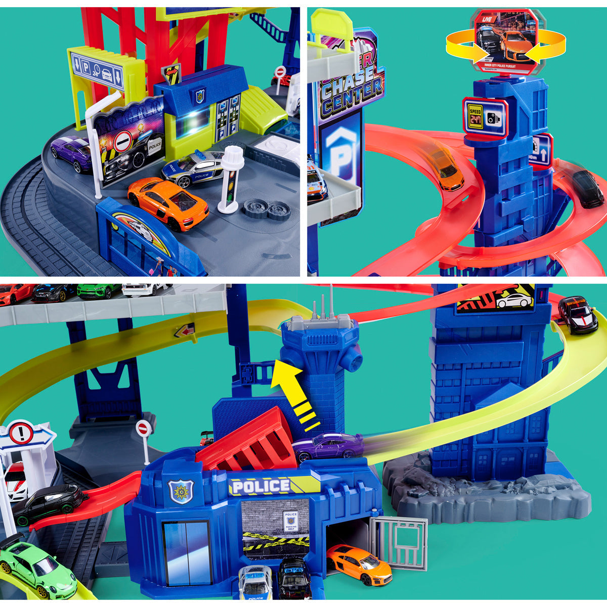 First, the motorized elevator takes you up the 6 floors of the car park – then the toy cars begin a high-speed chase through the parking garage!