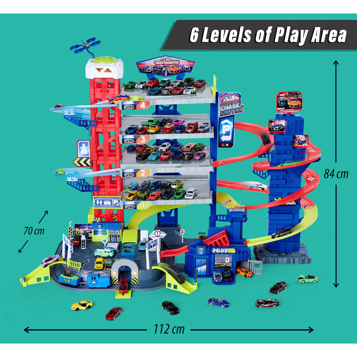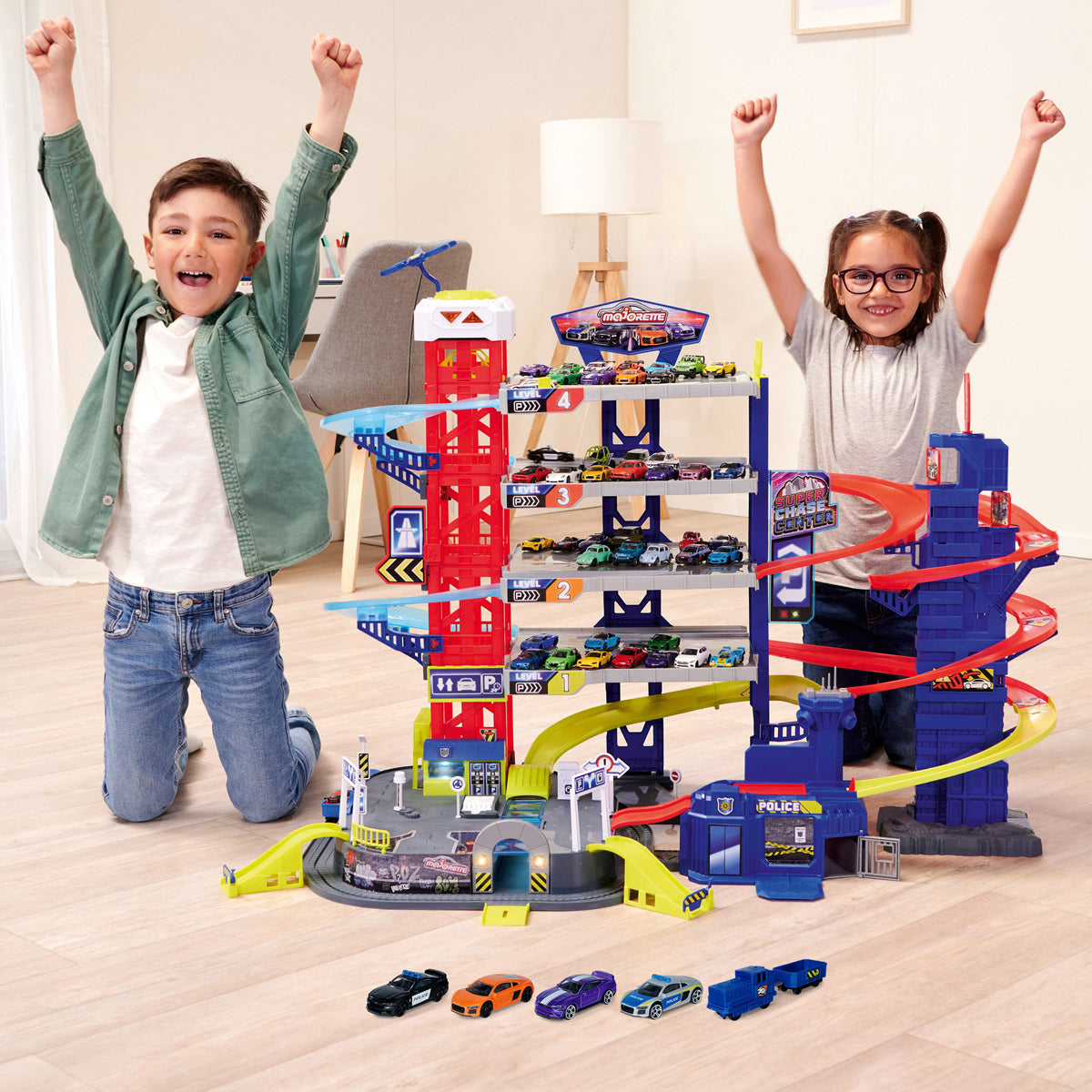 This 6 level Super Chase Centre Garage from Majorette features lights and sounds, a motorised lift, police station and 57 parking and storage spaces.