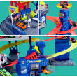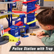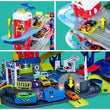 This huge parking garage has 57 parking and storage spaces, various light and sound effects, rotating billboards, 4 cars, a battery-operated train, and a sticker sheet