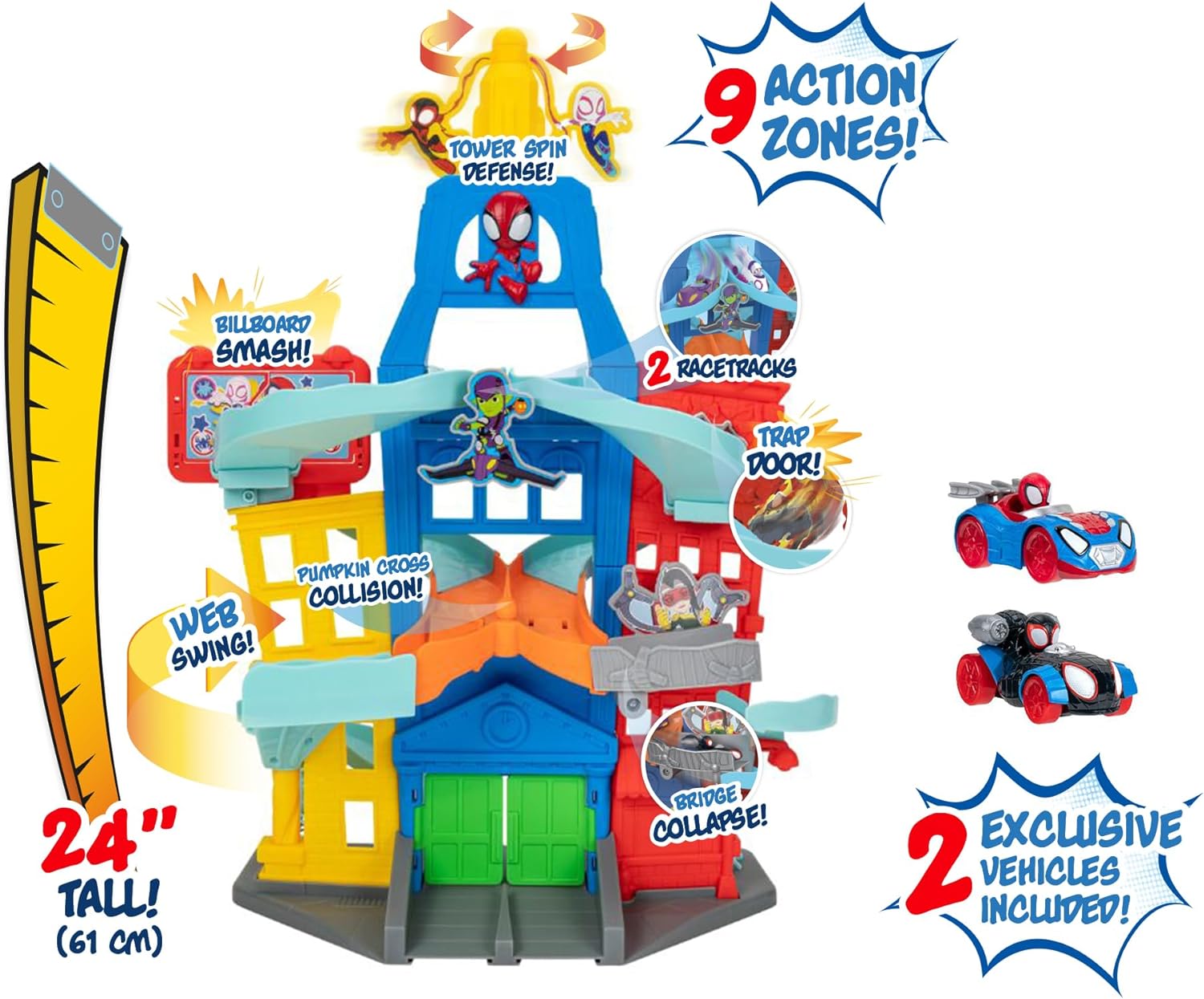Introducing the Track Set Spidey Amazing Metals City Track Set - a thrilling addition to any young adventurers toy collection. The set features a realistic cityscape track with lights and sound, 12 action zones and 3 level elevator for Spidey to navigate. Includes 3inch diecast vehicles