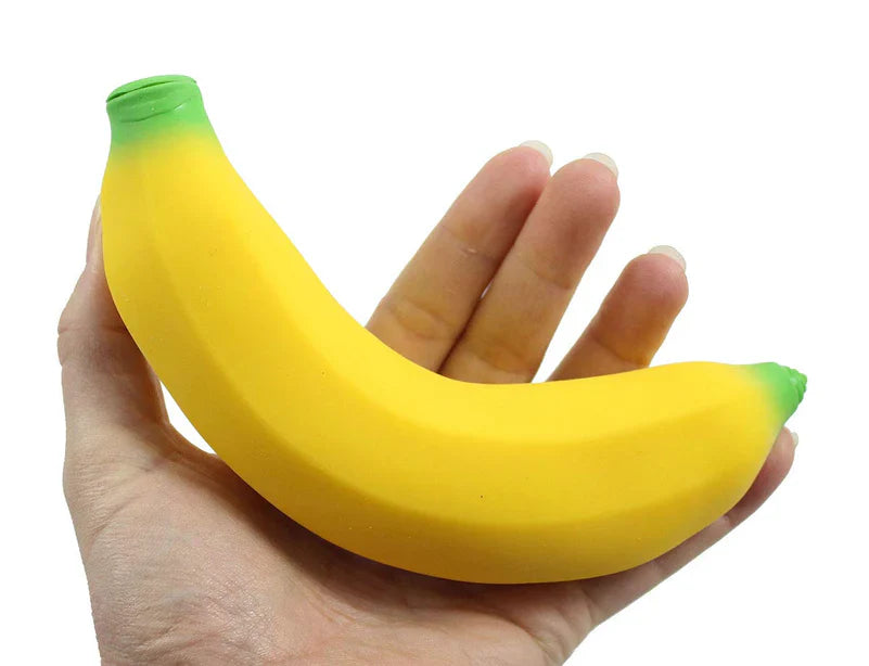 Squishy stress toy shaped like a banana. Filled with a flour like substance, this large banana is great fun to squeeze, stretch and squash, and provides a very satisfying tactile experience.