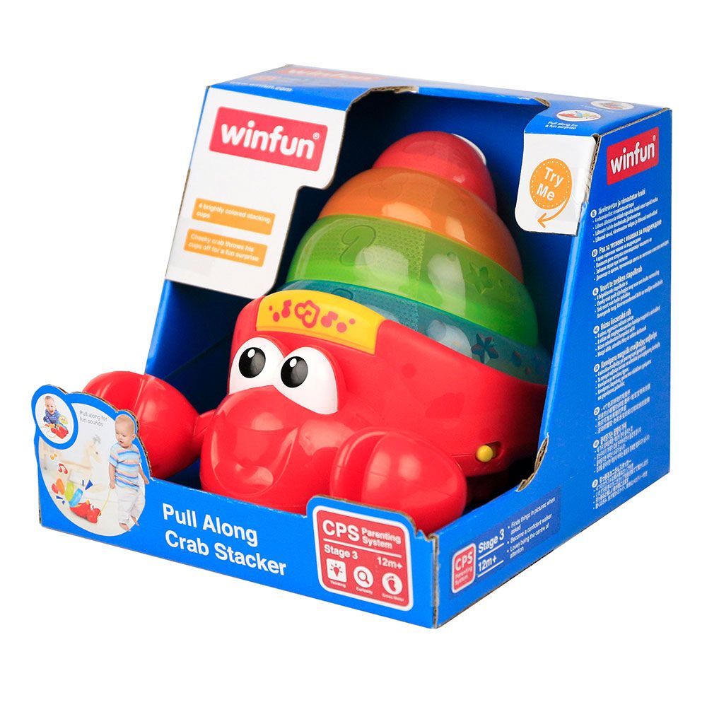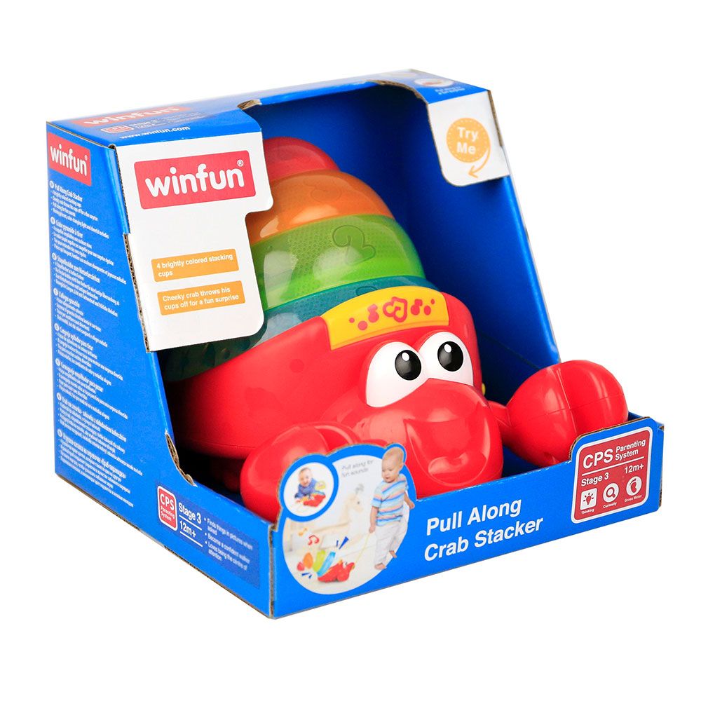 4 brightly colored stacking cups, Cheeky crab throws his cups off for a fun surprise, Pull along for fun sounds, Moving pincers, color-changing light and cheerful melodies. Age: 12 Months+.